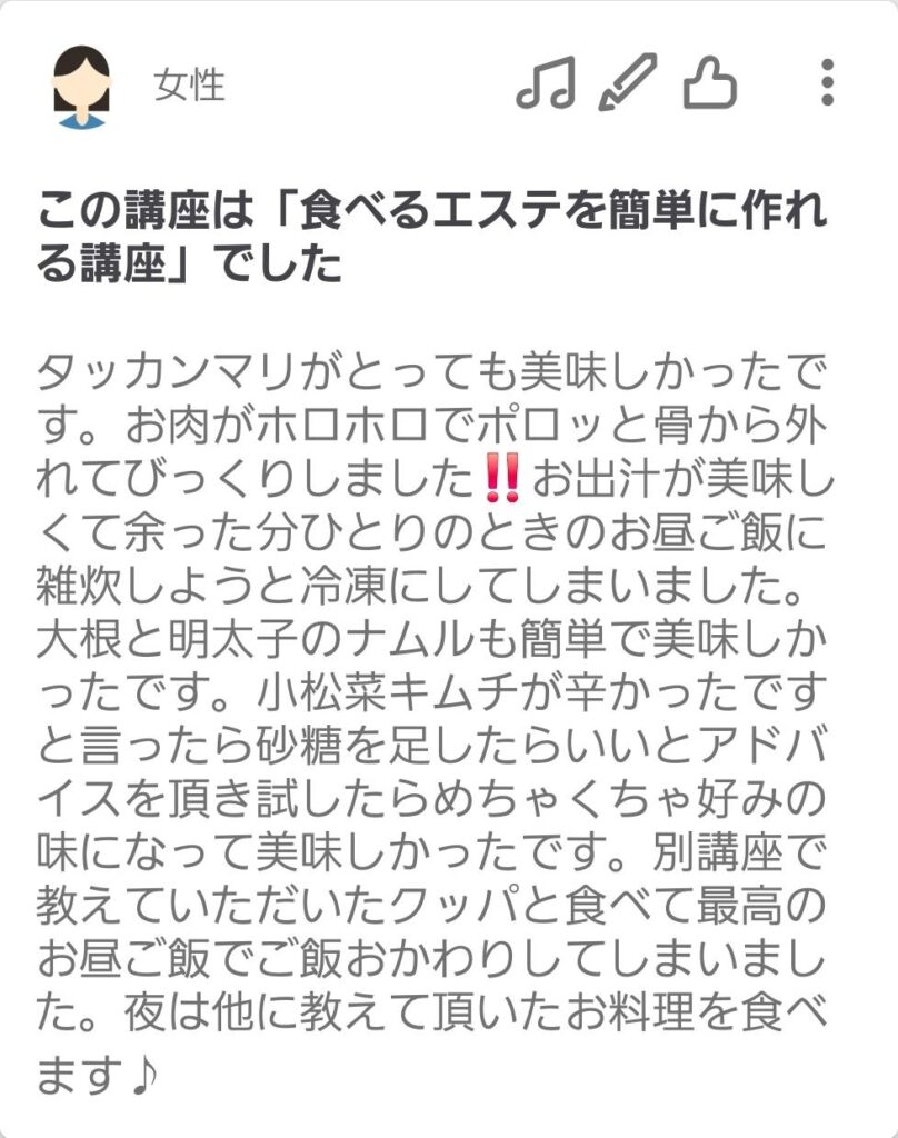 今までに、より多くの方との出会いを経験してきて思った事は、その人の想いに寄り添い、生徒様がこの先生から学んで良かったとか、料理を通じて、自分を整える事が出来た!など、さまざまな思いの生徒様と向き合う事が大事だなと思います。